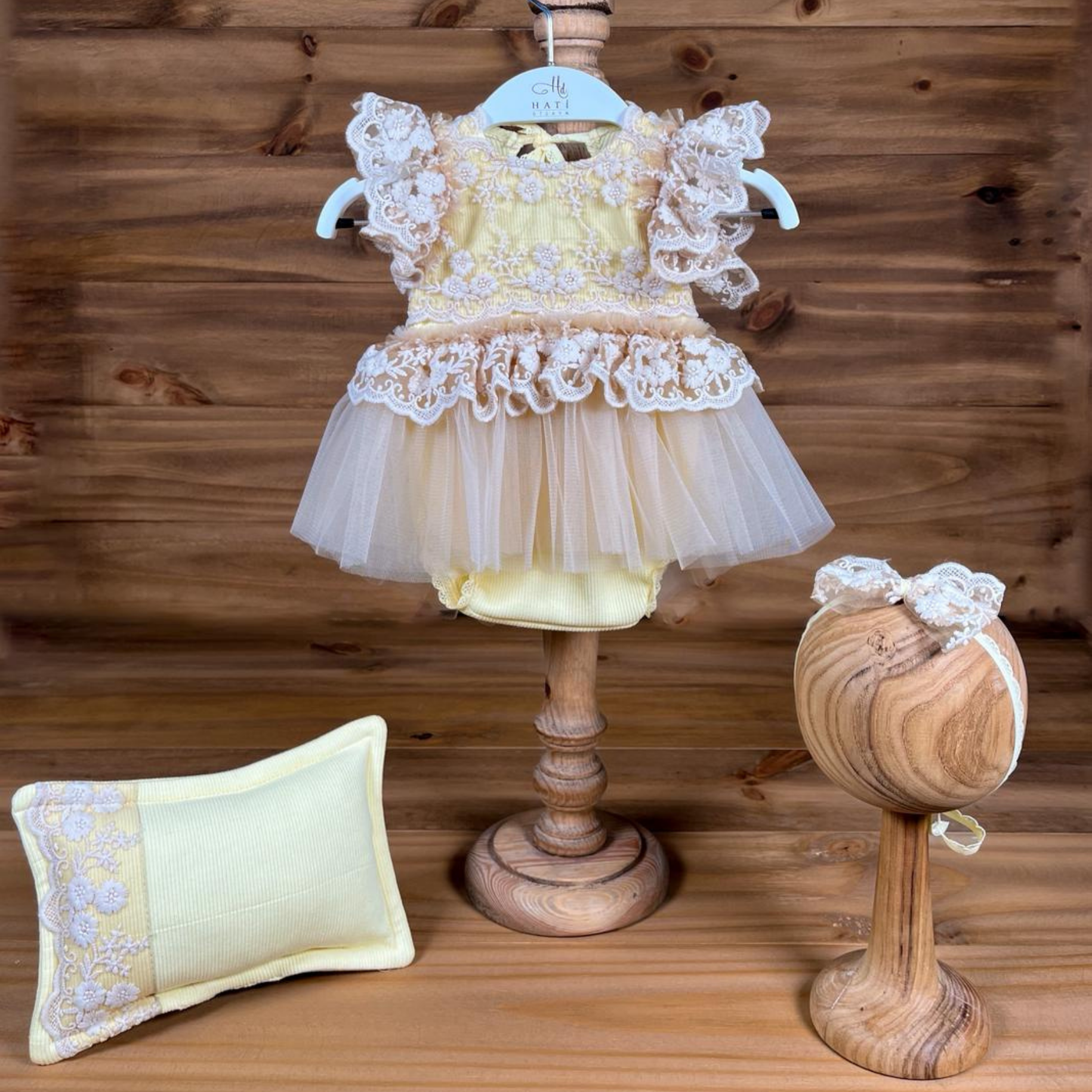 Bu zarif yenidoğan takımı, açık sarı tonu ve romantik dantel detaylarıyla minik prensesler için özenle hazırlandı. Fırfırlı kollar, tül etek bölümü ve çiçek desenli işlemeleriyle öne çıkan bu set; yenidoğan fotoğraf çekimleri, baby shower organizasyonları ve ilk özel anılar için mükemmel bir tercih.