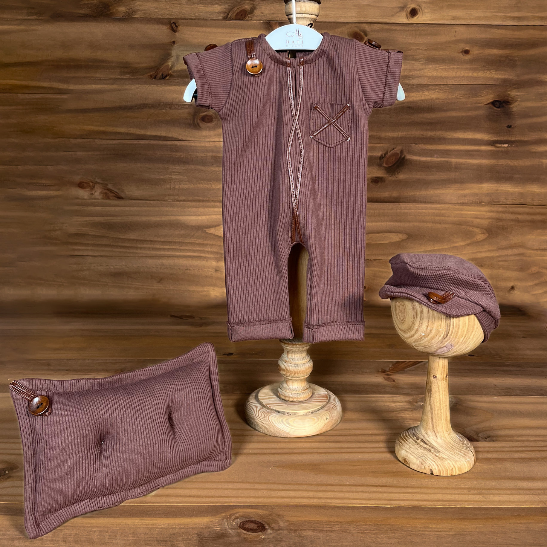 • 1 adet bakır kahve kısa kollu tulum (cep ve düğme detaylı) • 1 adet uyumlu düğmeli şapka • 1 adet dolgulu mini yastık