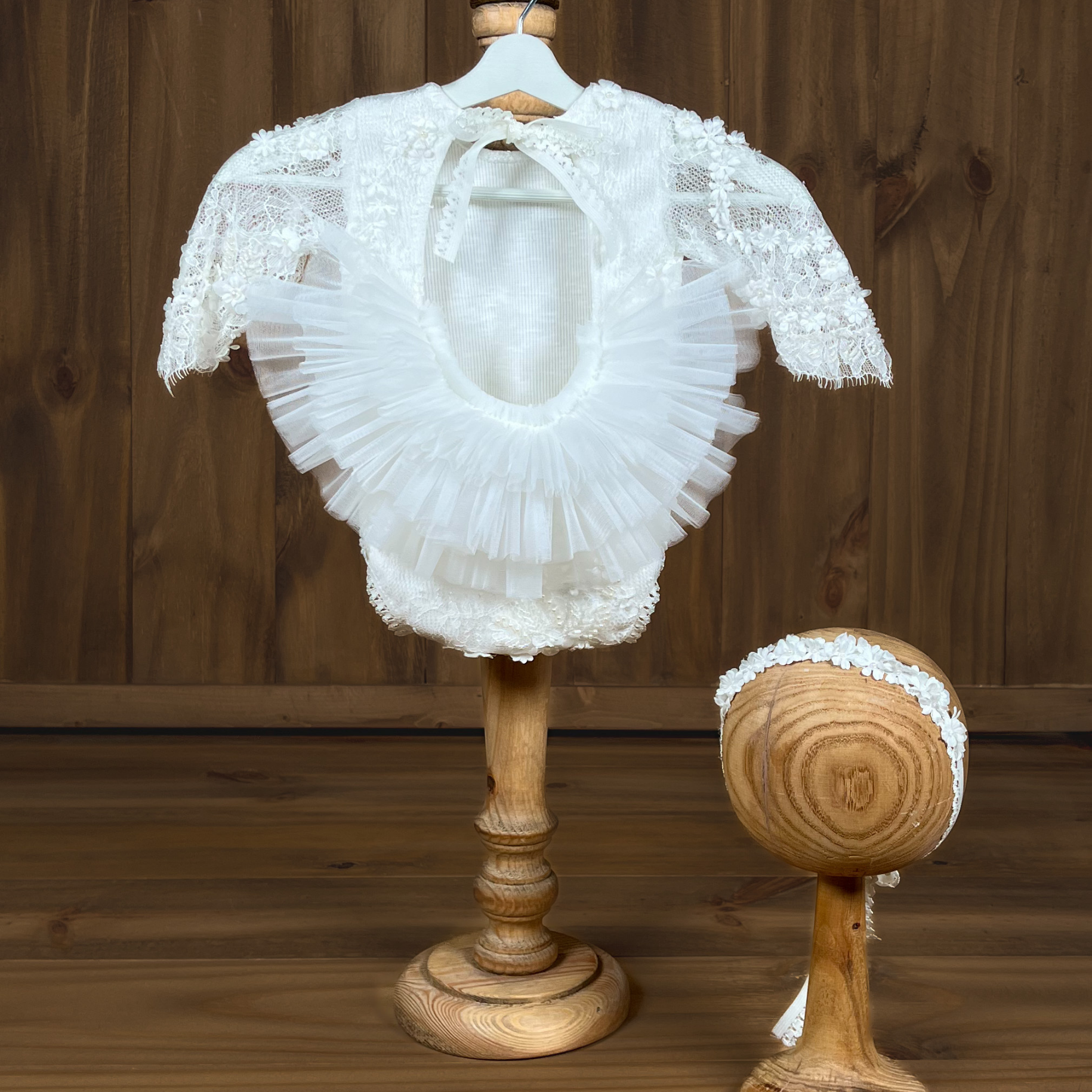 • 1 adet 3D çiçek işlemeli tulum • 1 adet uyumlu taç/bant
