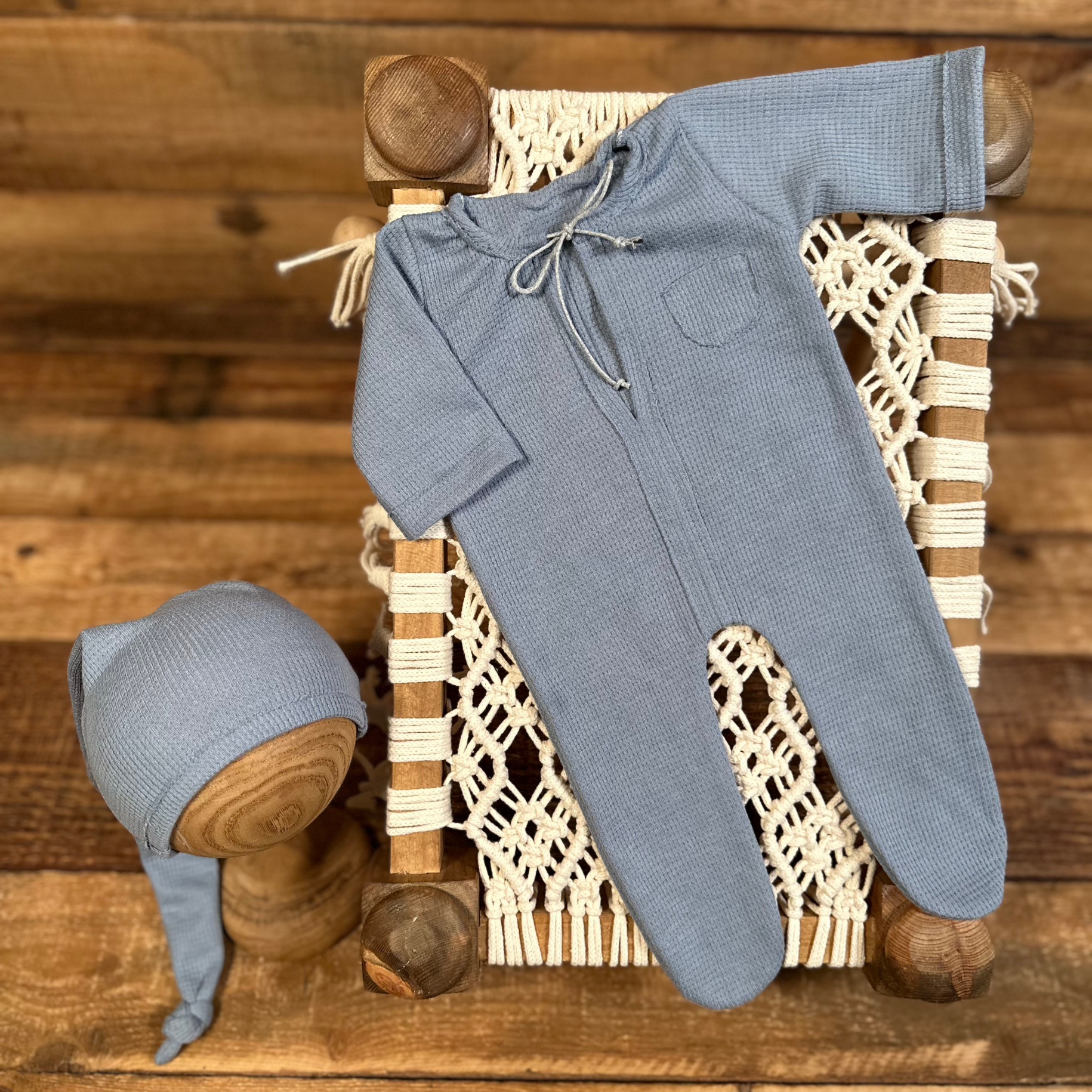 Bu mavi yenidoğan tulum ve şapka takımı, sade ve zarif tasarımıyla bebek fotoğraf çekimlerinde şıklığı ön plana çıkarır. Yumuşak dokusu sayesinde bebeğinizin cildine nazikçe temas eder, aynı zamanda rahatça poz vermesini sağlar. Göğüs kısmındaki küçük cep detayı ve yakadaki bağcıklar, minimalist bir tarz arayanlar için özel olarak tasarlanmıştır.