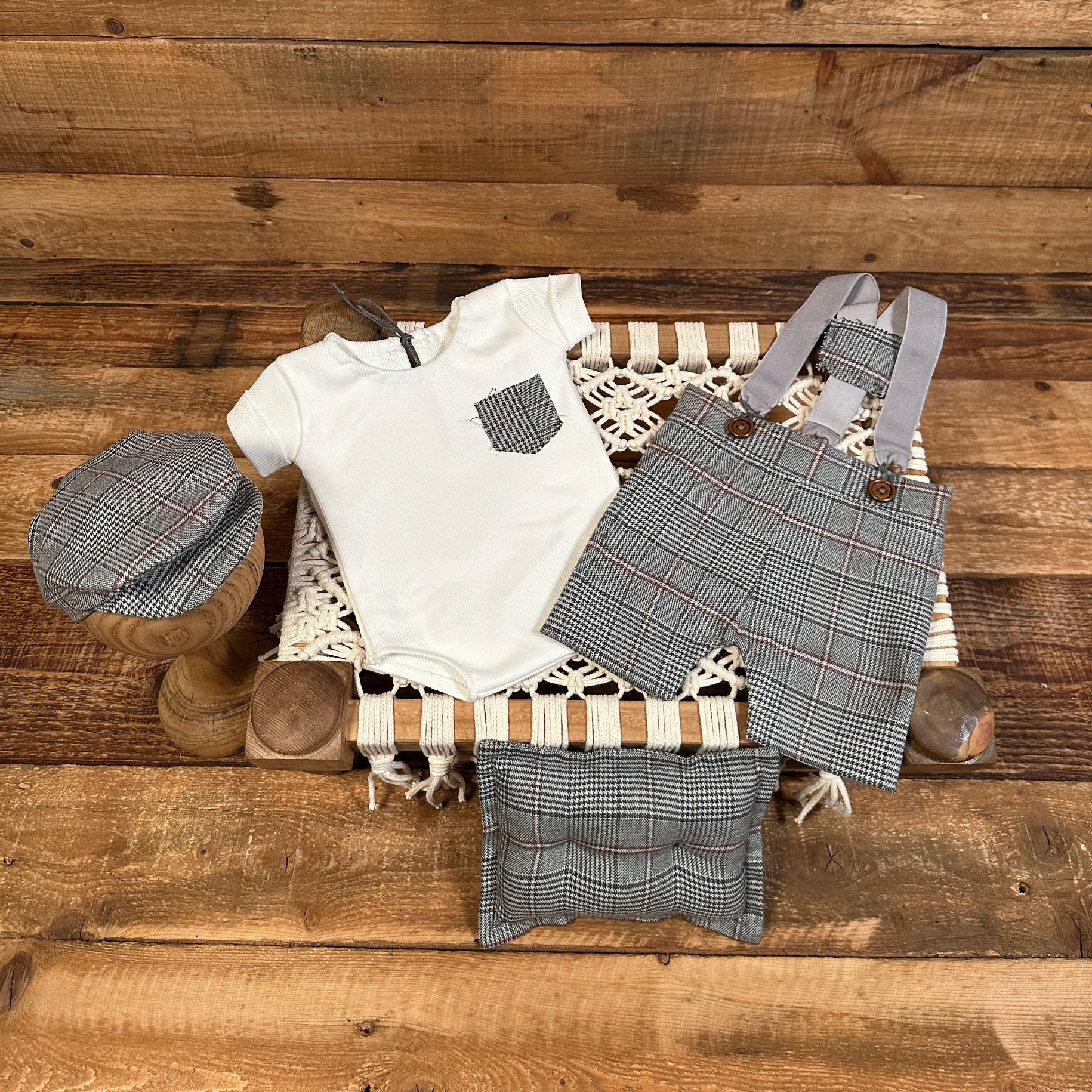 Gri Ekose Şortlu Yenidoğan Erkek Takımı – 4 Parça Set