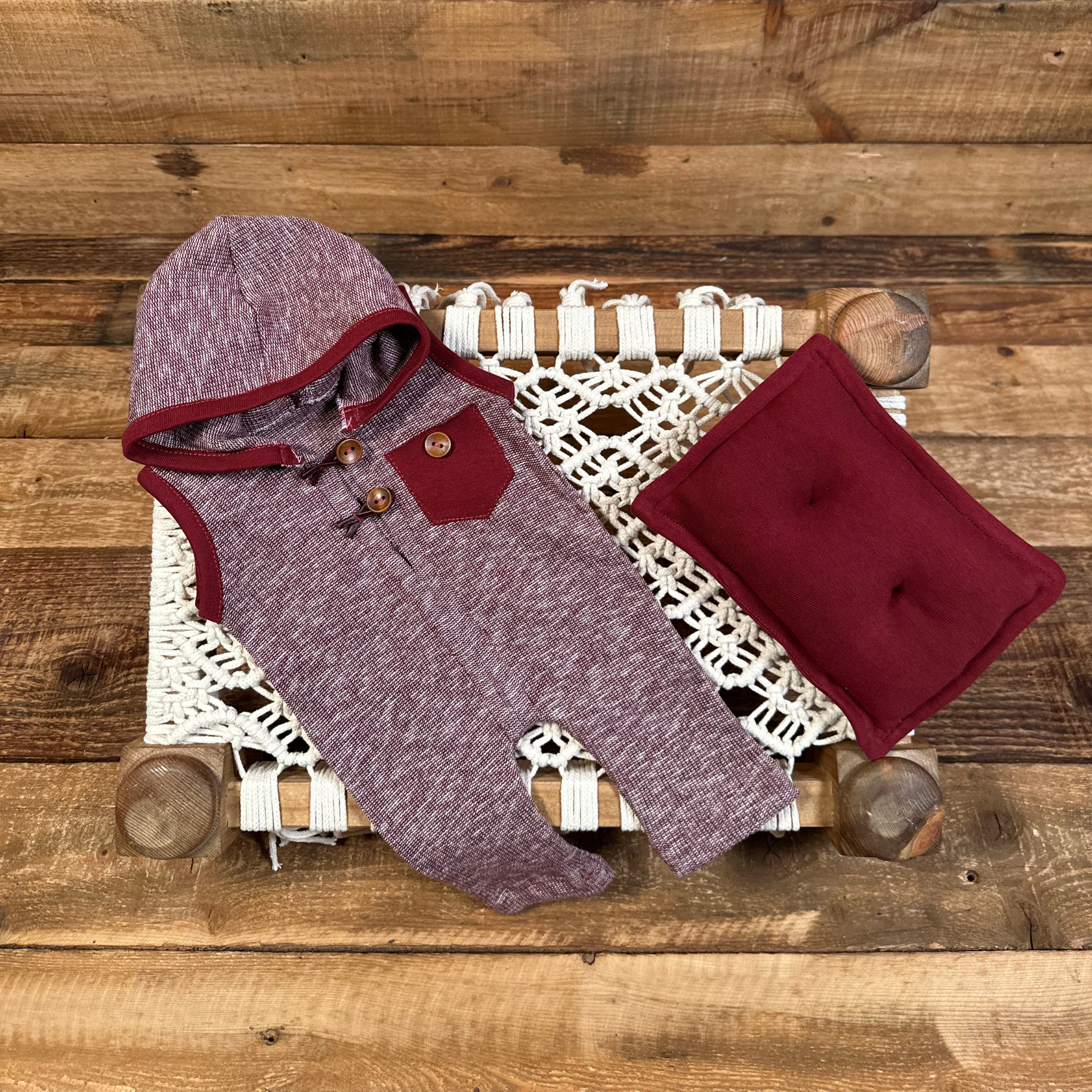 Kapüşonlu Bordo Yenidoğan Tulum ve Yastık Seti | Erkek Bebek Fotoğraf Çekim Kıyafeti