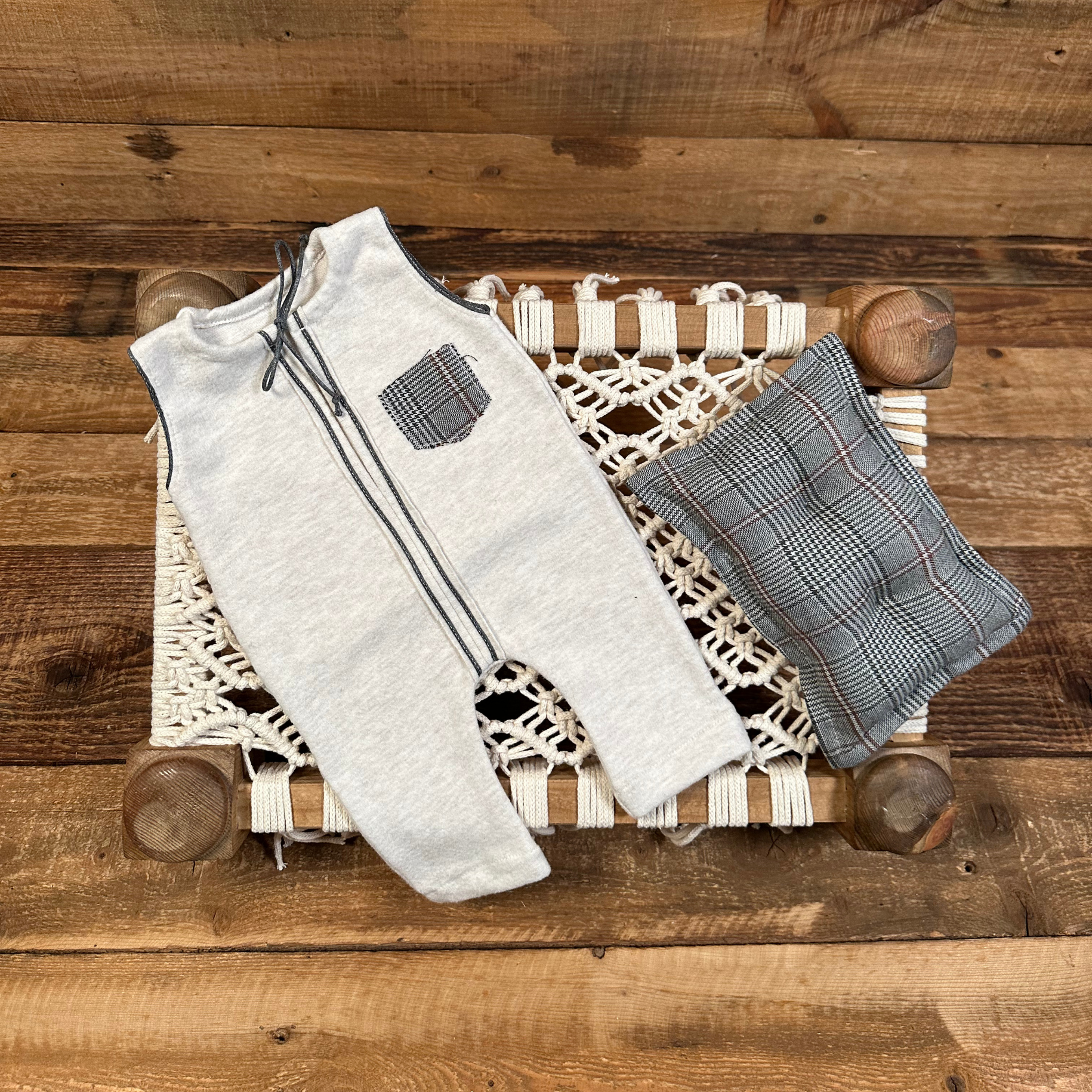 Kareli Cepli Kolsuz Erkek Yenidoğan Tulum ve Yastık Seti – Fotoğraf Çekimi İçin