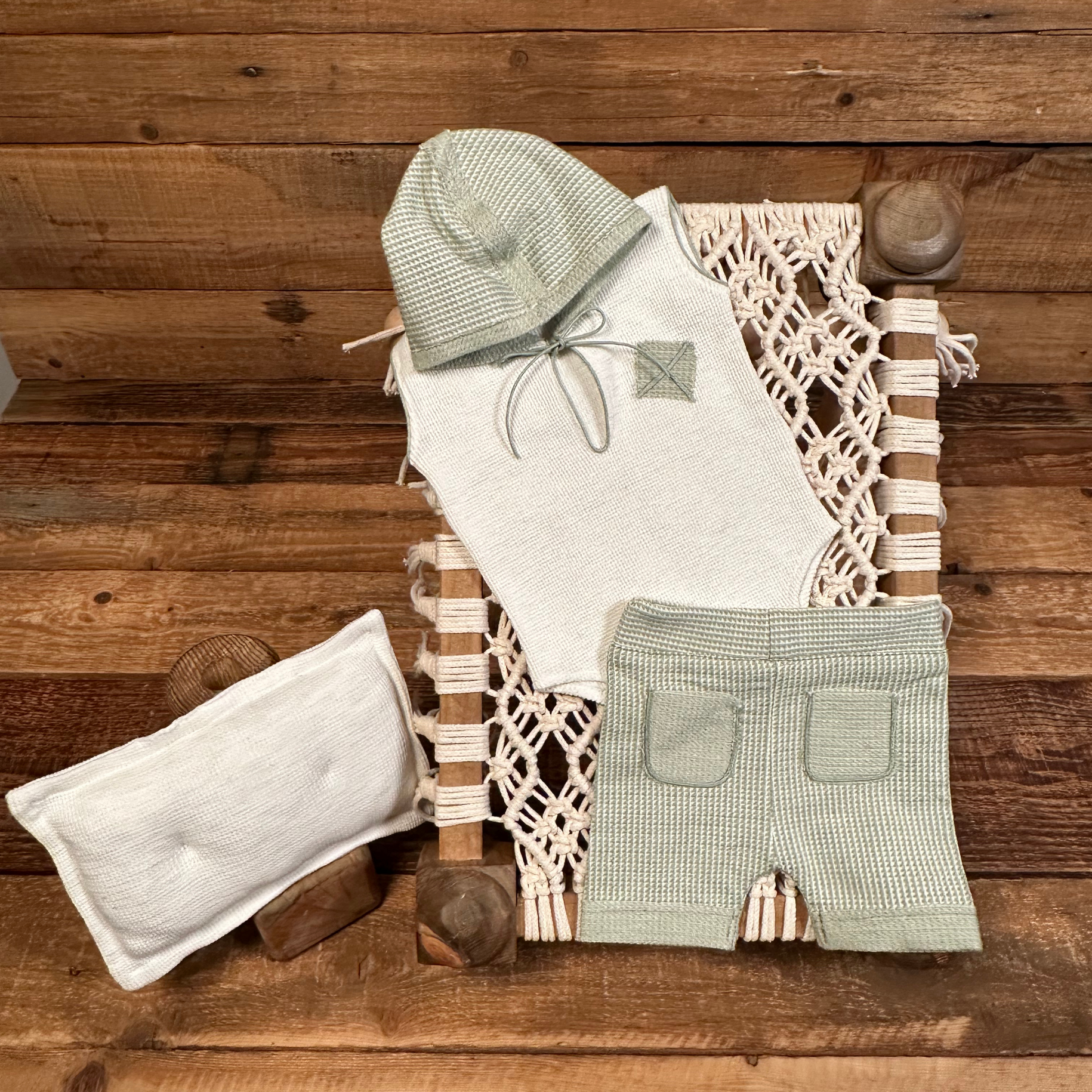 Rahat kesimi ve sade renk uyumuyla ön plana çıkan bu 3 parçalı yenidoğan takım, minik modeller için huzurlu bir stil sunar. Krem renkli yumuşak tulum, mint yeşili şort ve kapüşonlu şapkadan oluşan bu set, özellikle fotoğraf çekimleri için ideal kombinasyonu sağlar.