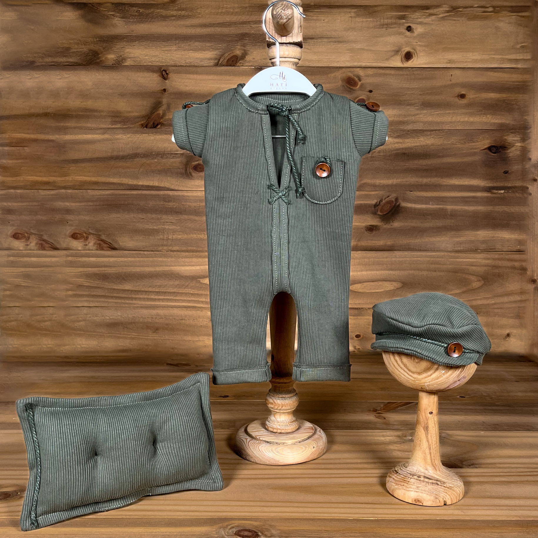 Doğal haki yeşili rengiyle öne çıkan bu yenidoğan erkek bebek tulum takımı, özel çekimlerde sıcak ve sakin bir atmosfer yaratmak isteyenler için tasarlandı. Düğme ve cep detaylarıyla tamamlanan tuluma, aynı kumaştan şapka ve yastık eşlik eder.