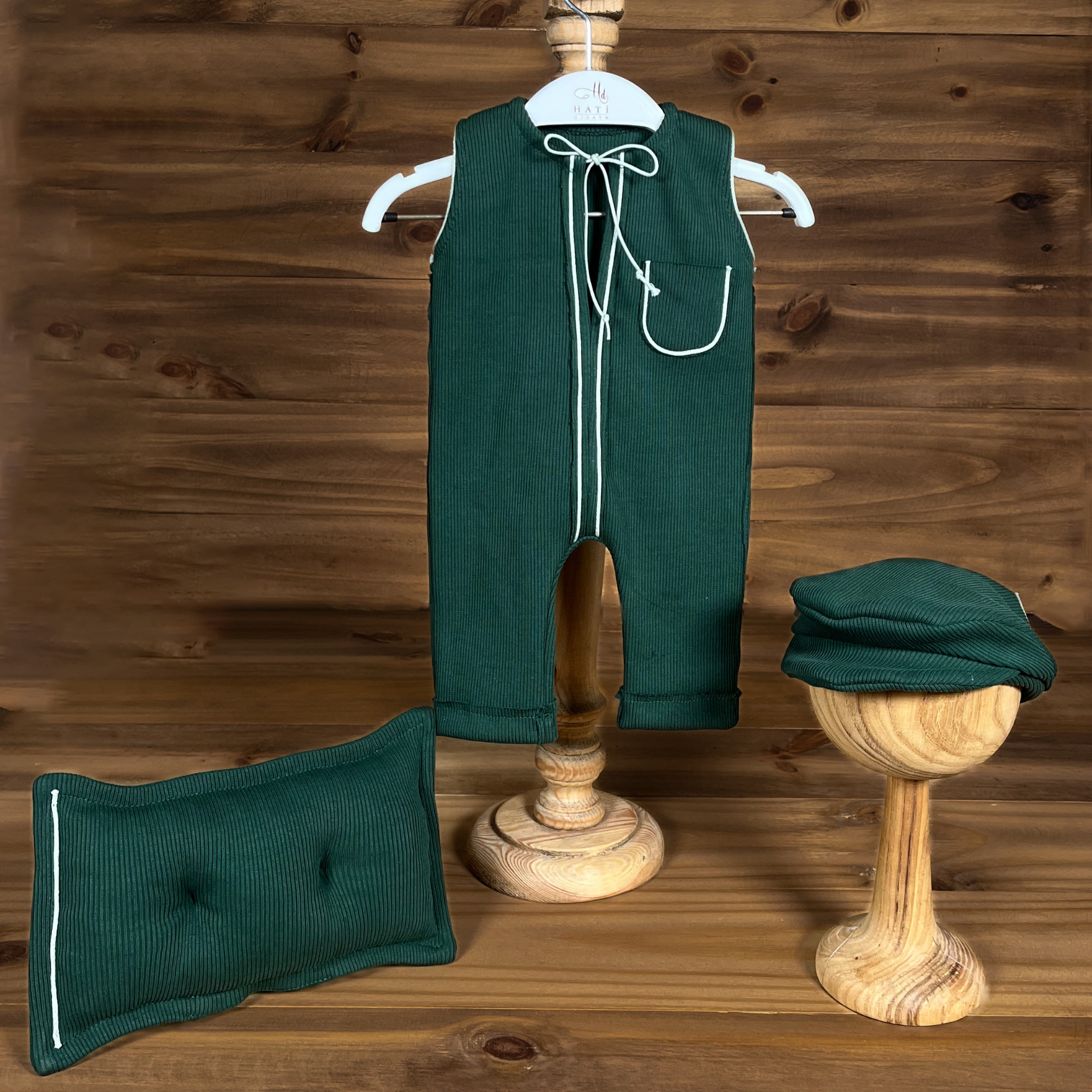 Zümrüt yeşili tonlarındaki bu zarif erkek bebek tulum seti, yenidoğan fotoğraf çekimleri için özel olarak tasarlanmıştır. Modern ve sade çizgileriyle öne çıkan takım, rahat kesimi sayesinde bebeğinizin konforunu ön planda tutar.