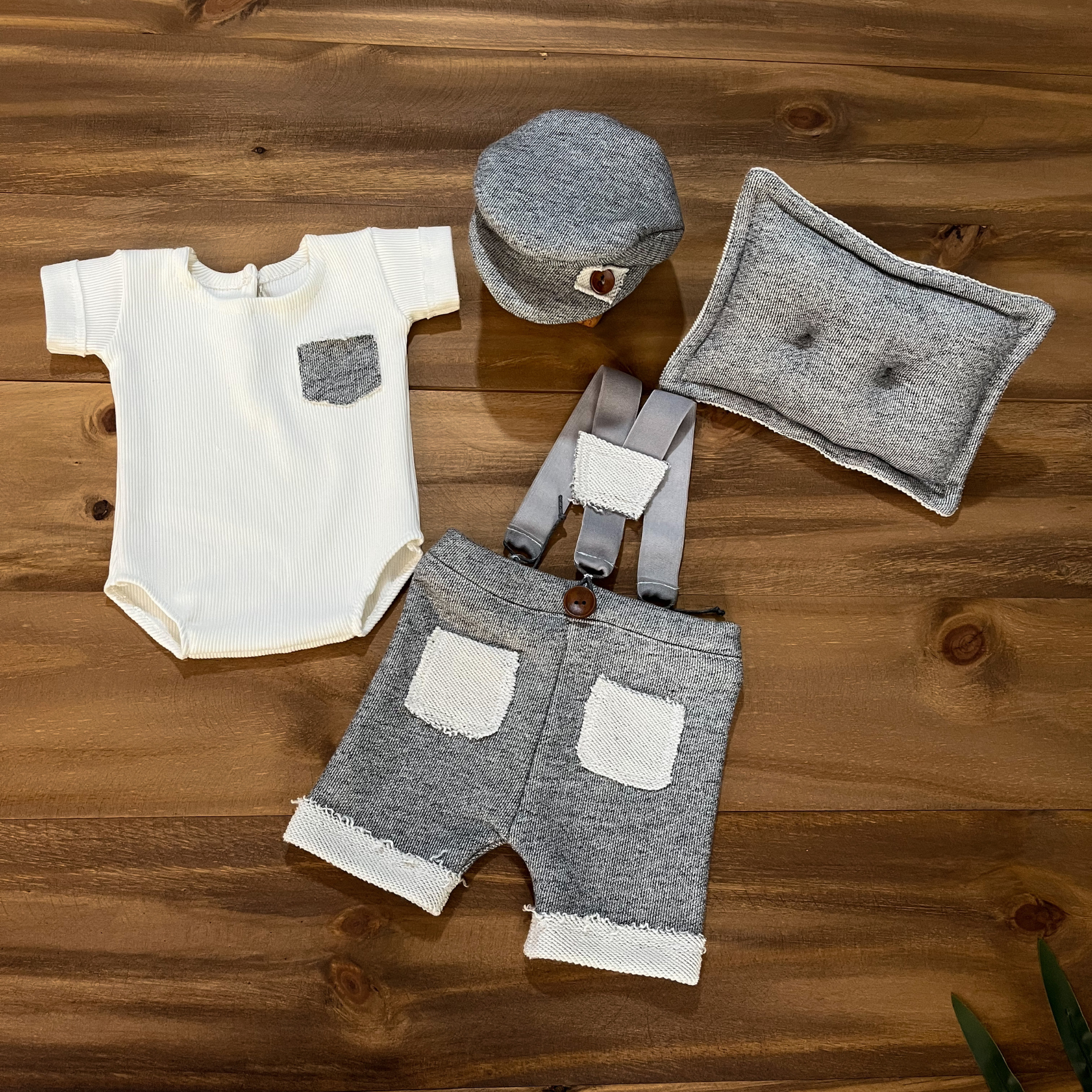 Gri Askılı Şortlu YeniDoğan Fotoğraf Çekim Takımı | 4 Parça Set | Erkek Bebek Stili