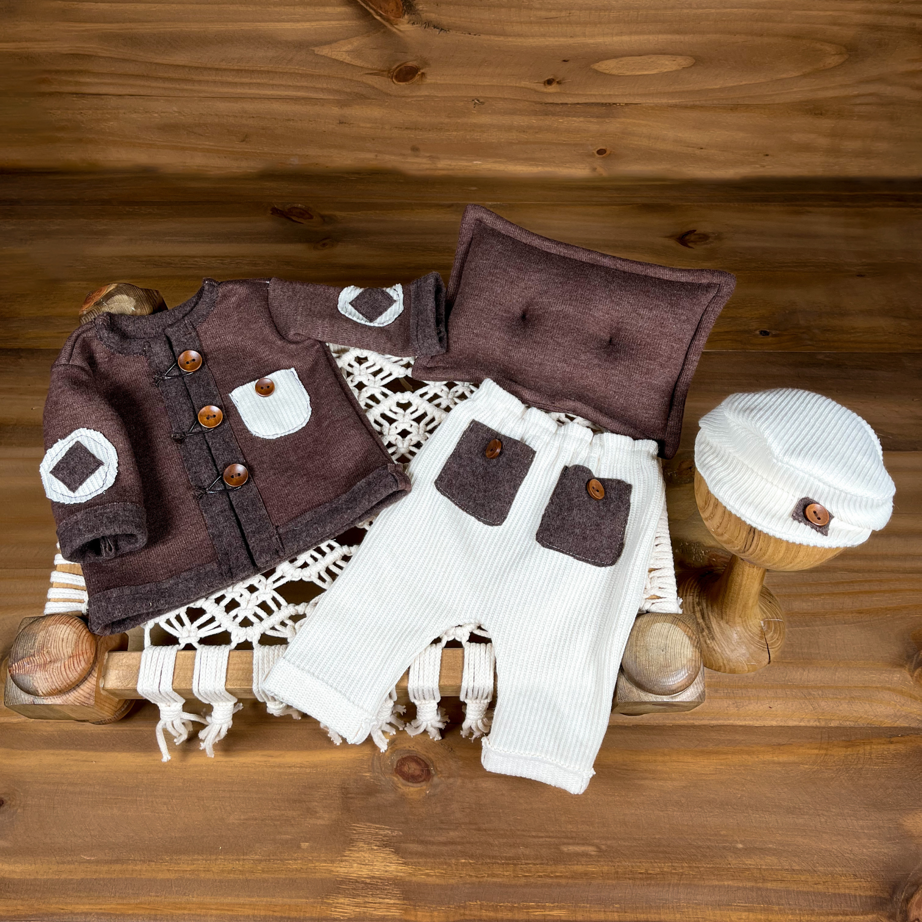 Bu özel tasarım 4 parçalık yenidoğan erkek takımı, sıcak kahve tonları ve zarif düğme detaylarıyla doğal ve samimi sahneler oluşturmak isteyen anneler ve fotoğrafçılar için hazırlandı.