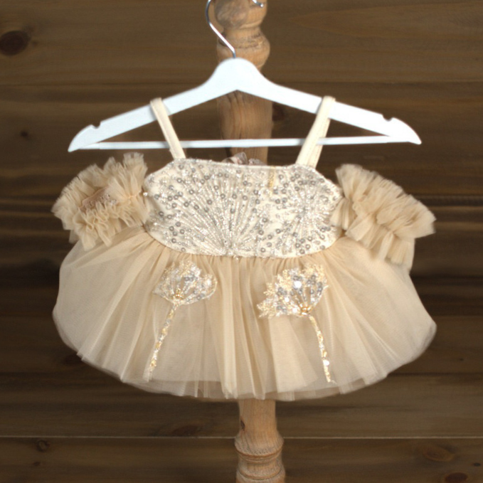 Krem Rengi Işıltılı Yenidoğan Tül Elbise – Özel Tasarım Bebek Kıyafeti