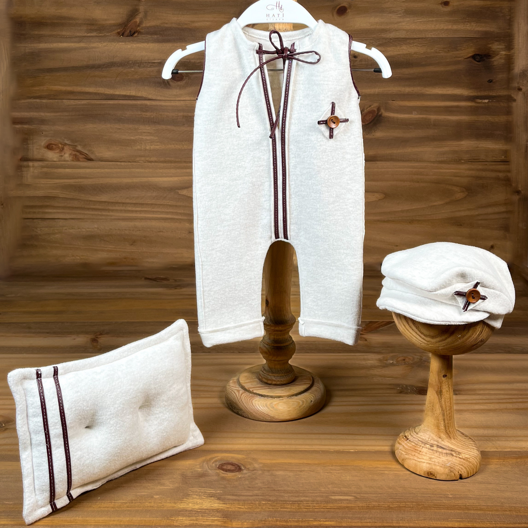 Krem Renk Yenidoğan Erkek Takımı – Deri Detaylı Tulum, Şapka ve Yastık 3'lü Set