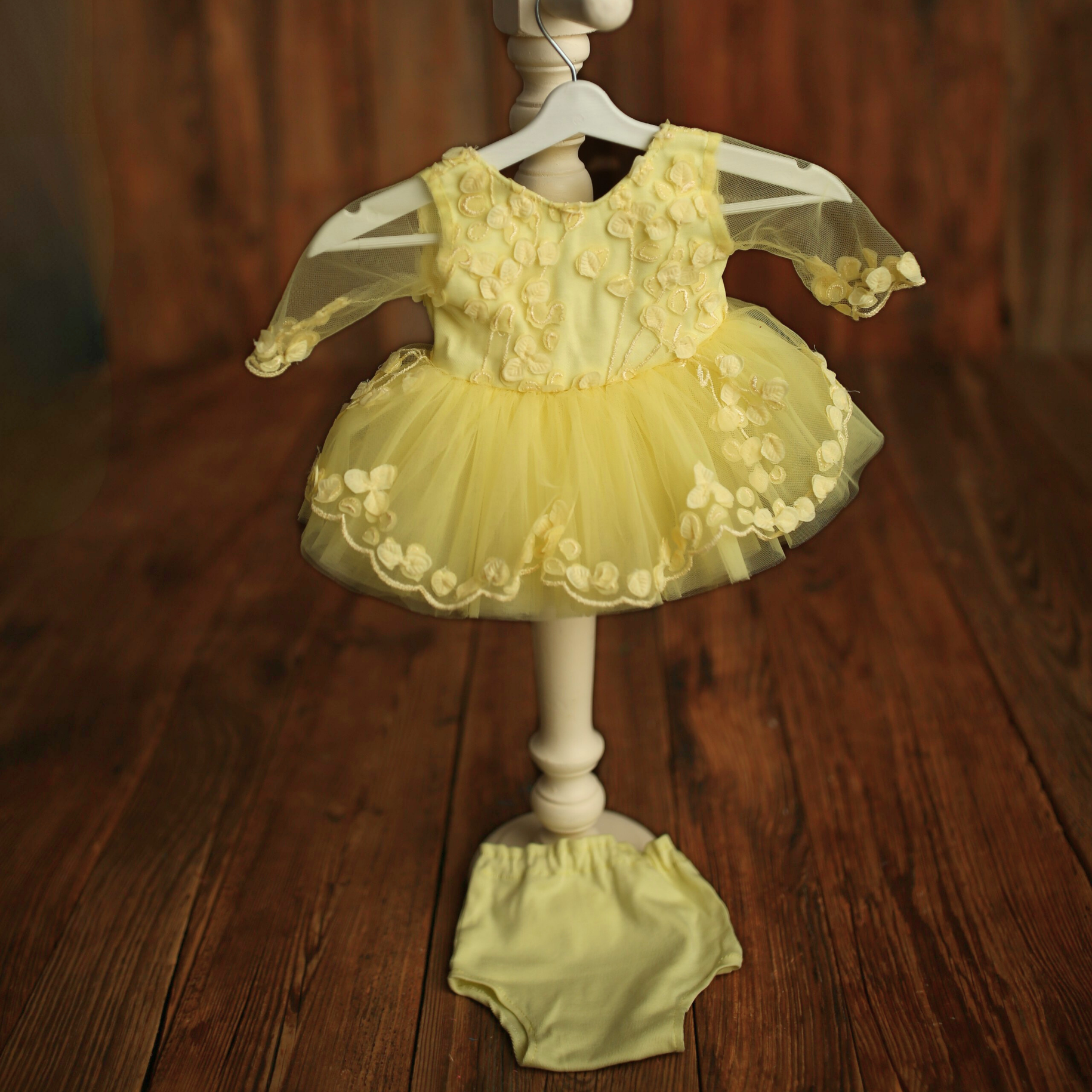 Yumuşak sarı tonlarıyla ışığı harika yansıtan bu yenidoğan elbisesi, özellikle ilk çekimler ve stüdyo konseptleri için idealdir. Tül etek kısmı ve zarif kolları, sahneye romantik bir hava katar. Hafif ve rahat yapısıyla bebeğin cildine dosttur.