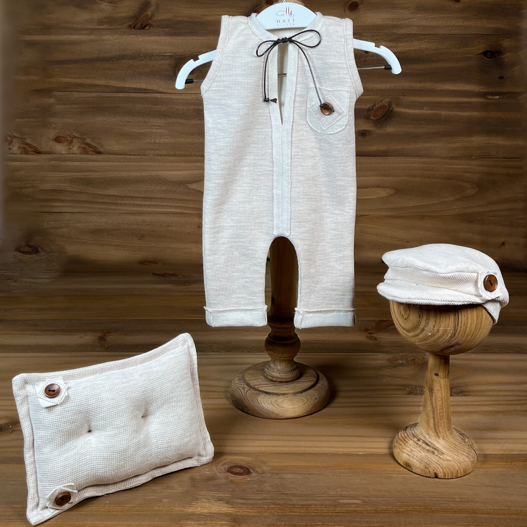Doğal ve sade şıklığı bir araya getiren bu zarif erkek yenidoğan tulum seti, vizon tonlarının sıcaklığıyla tasarlandı. Modern çizgiler taşıyan takım, hem profesyonel fotoğraf çekimleri için hem de özel anılarınızı taçlandırmak için ideal bir seçimdir.